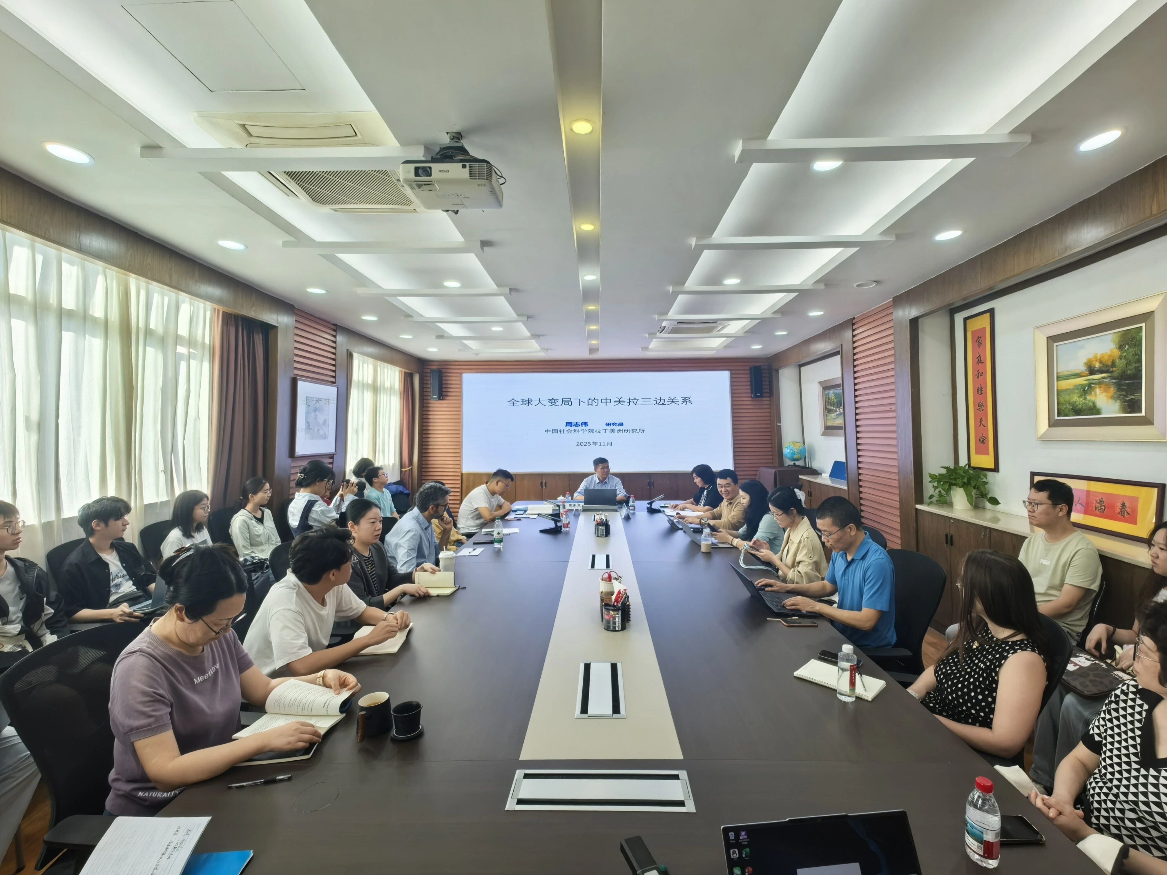11月10日,我院成功举办云山学术沙龙第387期,讲座由来自中国社科院拉美所的周志伟教授主讲,主题为“全球大变局下的中美拉三边关系”。我院教师、硕博士学生、我校拉美中心的师生共同参与。本次讲座由我院院长李青教授主持。