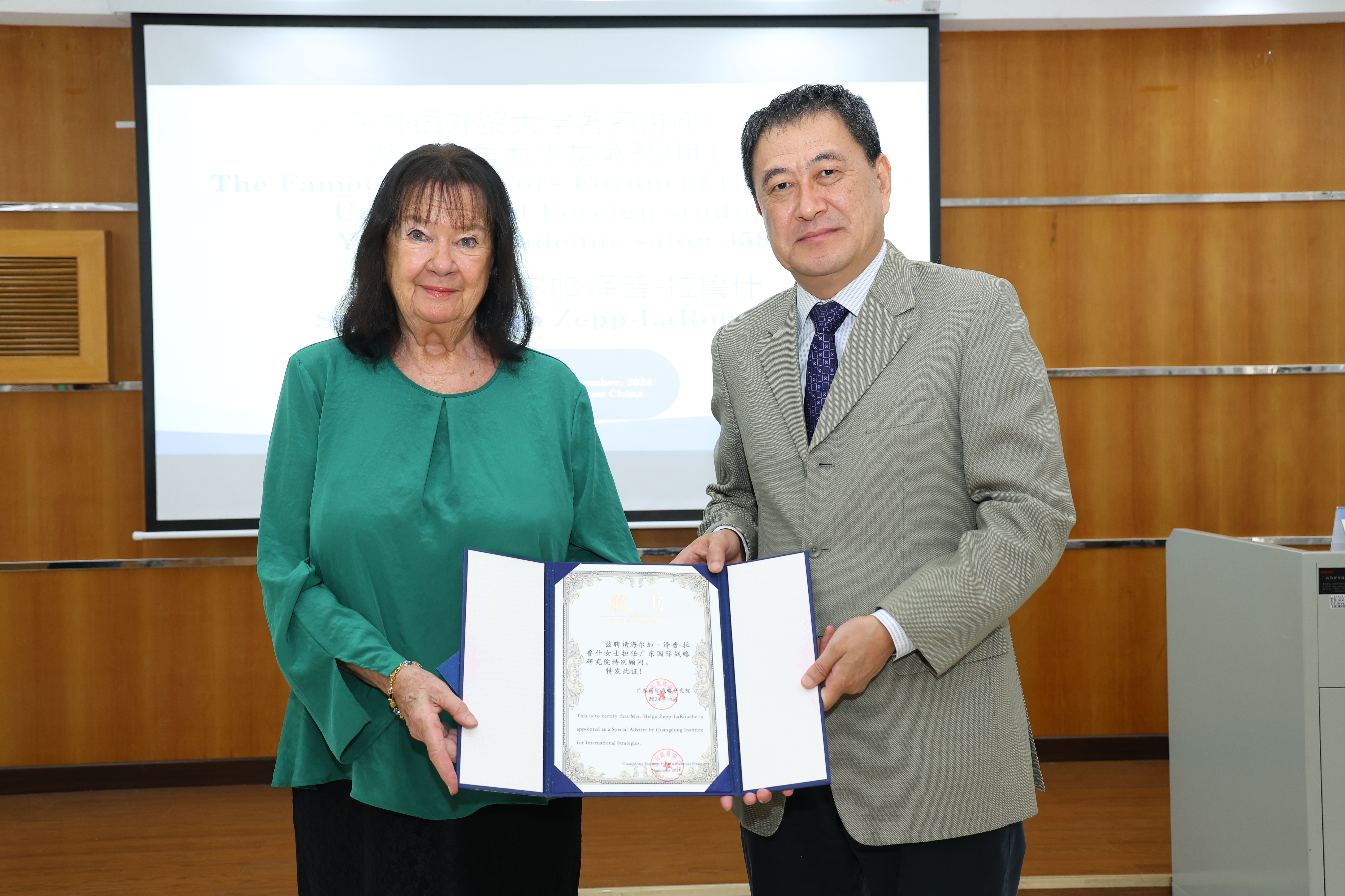 李形教授对海尔加·泽普-拉鲁什的到来表示了热烈欢迎,并简要介绍了其与席勒研究所在国际政治、国际关系等领域的卓越成就。随后,隋广军教授代表我院为海加尔女士颁发特别顾问聘书,并合影留念。海尔加对受聘表示感谢,她表示,希望未来能与广东国际战略研究院加强合作,共同为世界和平与国际合作贡献力量,同时也对受到广东国际战略研究院的重视与支持表达了感激。