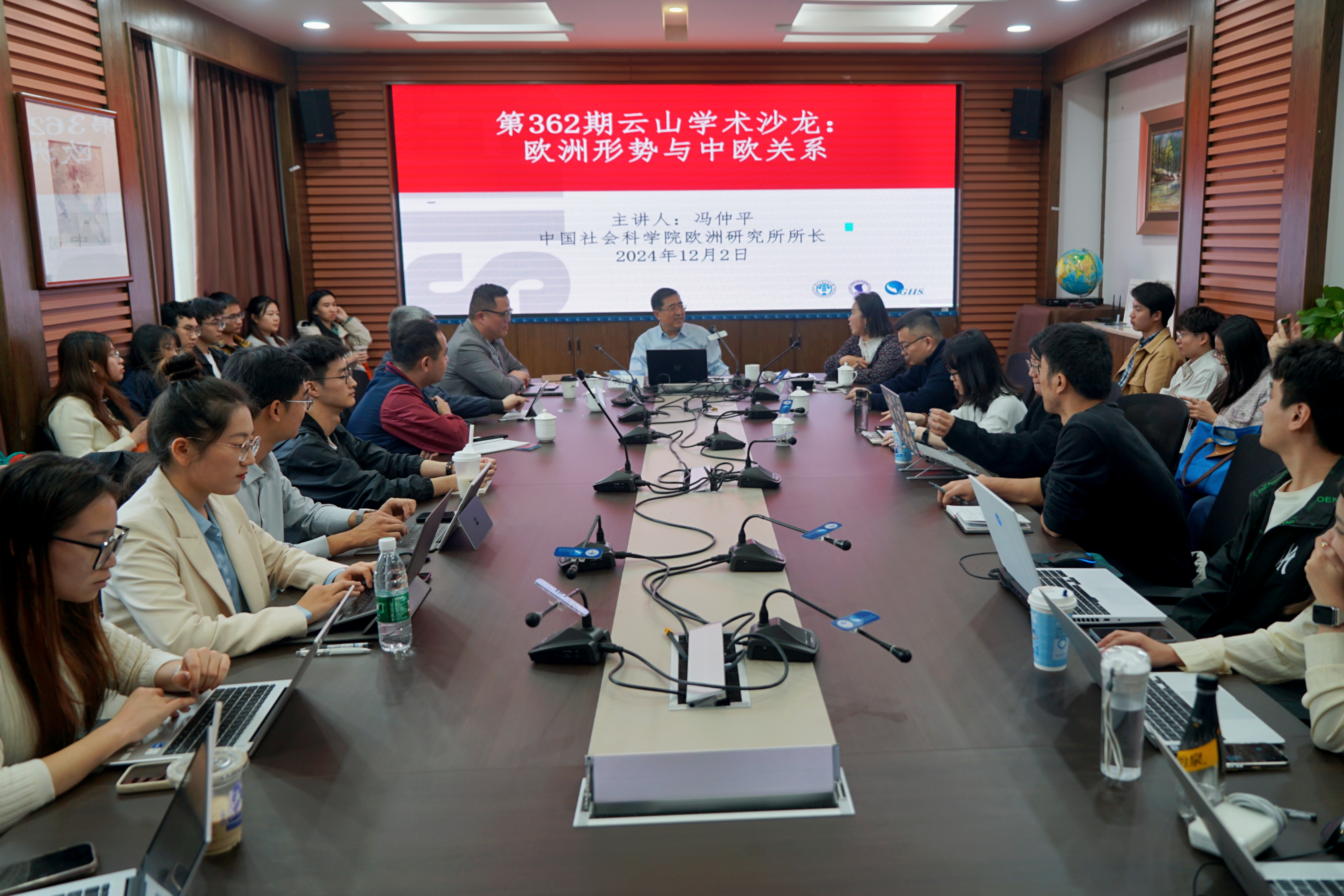 2024年12月2日下午,广东国际战略研究院举办了第362期云山学术沙龙,特邀中国社会科学院欧洲研究所所长冯仲平主讲,主题为“欧洲形势与中欧关系”。本次学术沙龙由我院副教授赖雪仪主持,浙江大学公共管理学院求是讲席教授沈伟、我院副院长周方银教授及韩永辉教授、我院师生代表参加了本次座谈交流。