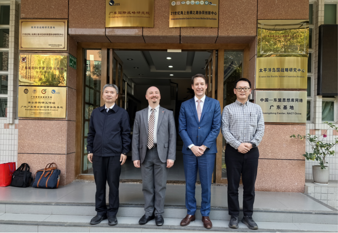 11月28日下午,美国驻广州总领事馆经济政治部主任冯海博(Eric Frater)和对外联络官员吴景安(Geoffrey Wessel)来访广东国际战略研究院。副院长周方银教授、外事秘书彭科明出席座谈交流。